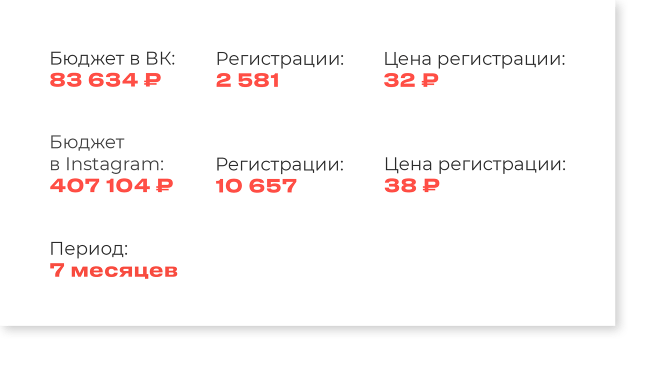 по-другому оптимизировать рекламную кампанию. Мы стали показывать рекламу тем, кто с большей вероятностью зарегистрируется на вебинар, а не просто кликнет по ссылке. Эта настройка, свежие аудитории и креативы позволили снизить цену за регистрацию более чем в 2 раза.