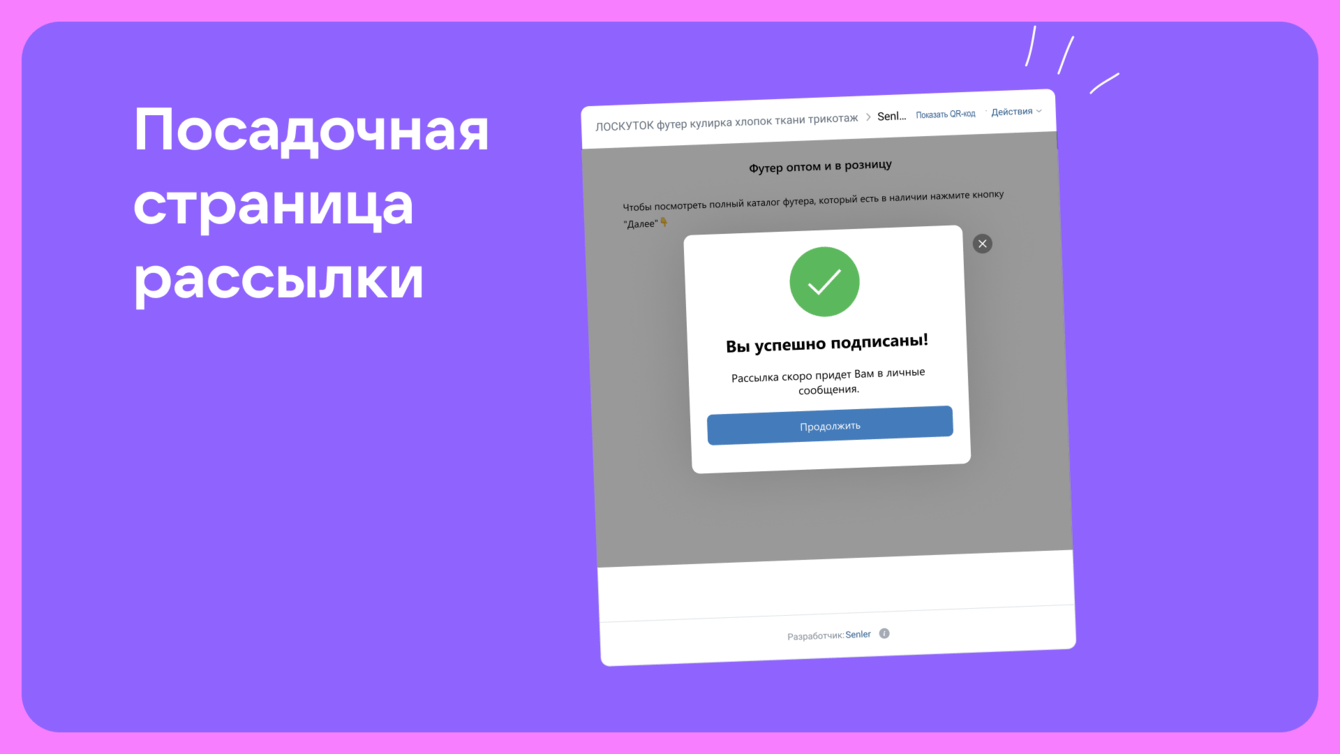 Благодаря тому, что не вели на ЛС сразу, а использовали такую воронку и минималистичную посадочную, отсеили нецелевую аудиторию. В результате все входящие сообщения в личку были только по теме покупки ткани. Конверсия из клика в подписку составила 26%.