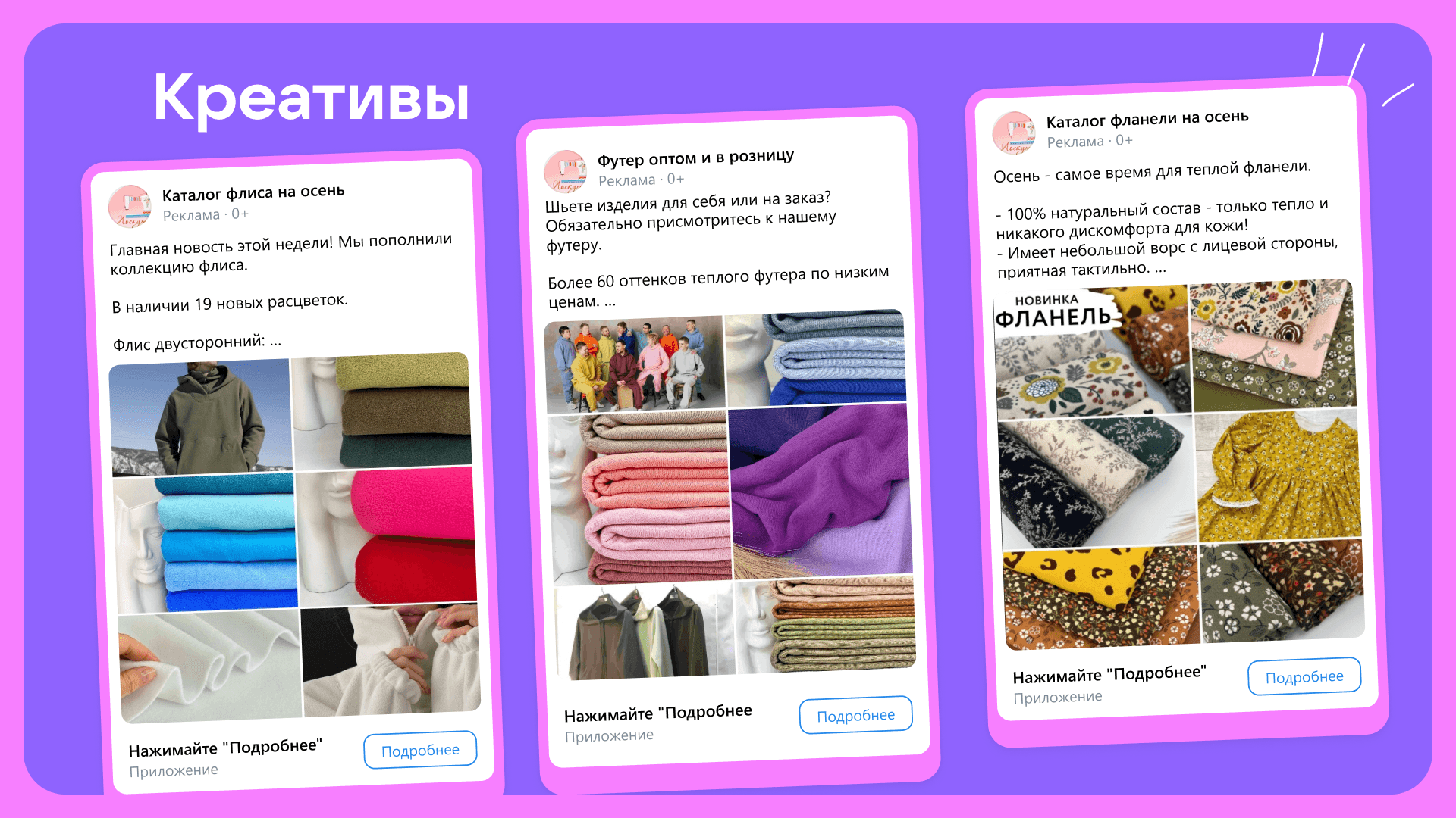 Благодаря тому, что не вели на ЛС сразу, а использовали такую воронку и минималистичную посадочную, отсеили нецелевую аудиторию. В результате все входящие сообщения в личку были только по теме покупки ткани. Конверсия из клика в подписку составила 26%.