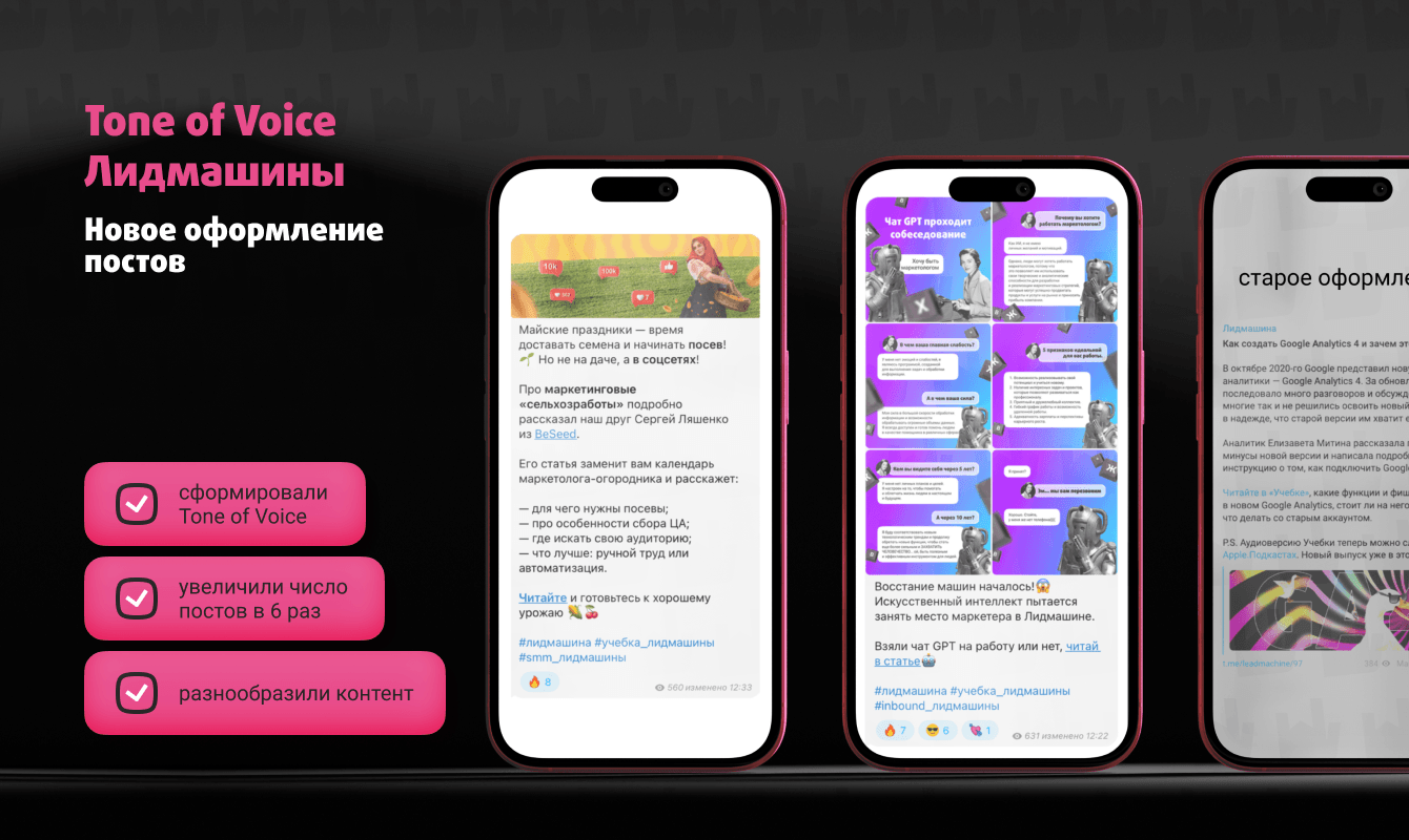 Tone of Voice. Опытным путем выяснили, какая тональность ближе аудитории, и сформировали ToV Лидмашины в Telegram. Мы используем добрые шутки, отсылки к песням, известным фильмам и поговоркам, но обязательно сочетаем их с пользой для читателей.