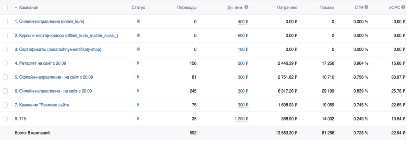 Эффективные настройки были — ключевые фразы и ретаргет. Стоимость клика в среднем выходила по 15 р. CTR 0,9%. Лучше всех сработал креатив универсальная запись макет.