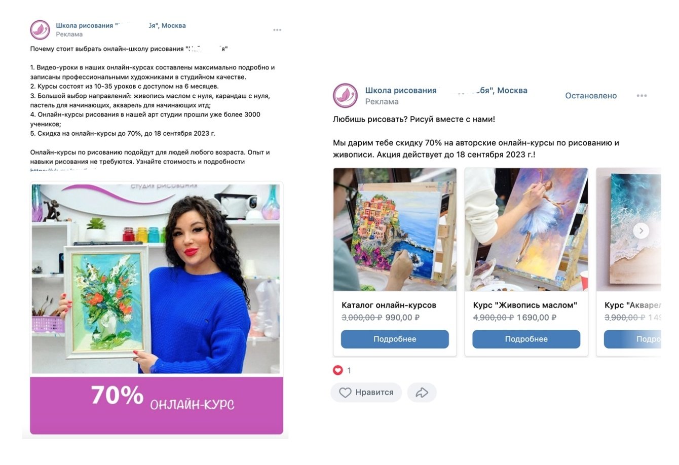 В рекламе нужно было продвигать онлайн курсы и офлайн, также мастер-классы. Акция в рекламы была 70% скидка на приобретение курса. Рекламу запускали на разные направления — «Карандаш с нуля», «Акварель», «Интерьерная картина», «Картина маслом» итд.
