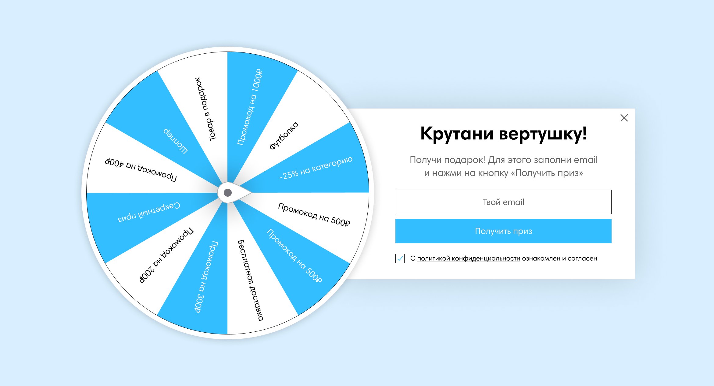 Механика представляет собой всплывающее окно во время сеанса на сайте. Посетителю предлагается поучаствовать в розыгрыше, прокрутив барабан. Для этого нужно оставить свою почту и нажать на кнопку «Получить приз». Тогда колесо начинает вращаться, а на оставленный email посетителю приходит промокод на выпавший подарок.