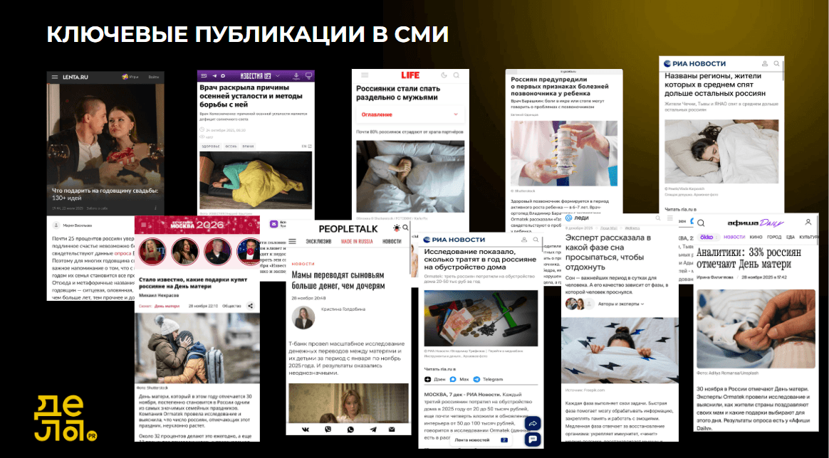 Работа была сосредоточена на формировании репутации бренда, поэтому мы ориентировались на СМИ Tier-1: Lenta.ru, «Известия», «Газета.ру», «РИА Новости», «Российская газета». Особое внимание мы уделили экспертному подходу, поэтому интервьюировали врачей, сомнологов, психологов и т.д.. Это напрямую способствовало закреплению экспертности бренда. Исследования дали возможность связать продукты бренда с широкими социальными трендами (отношения, здоровье, быт) и усилить внимание федеральных СМИ. Выборка каждого исследования составляла 1500–2000 человек.