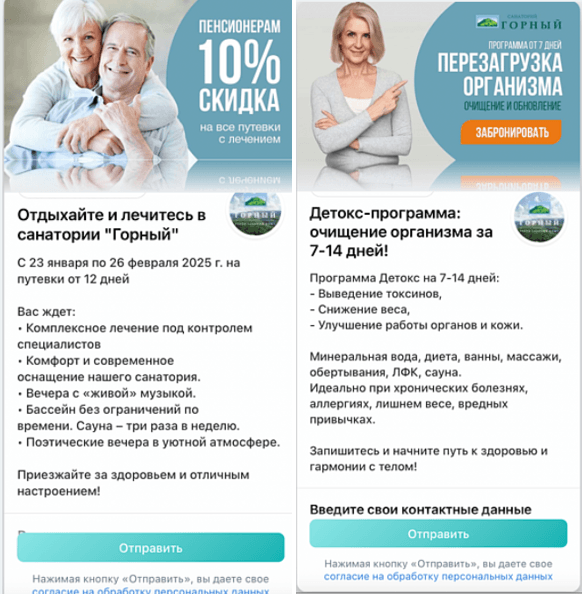 • Заголовки с акцентом на выгоду: «Лечение спины без операций», «Путёвка для родителей», «Оздоровление с видом на горы»