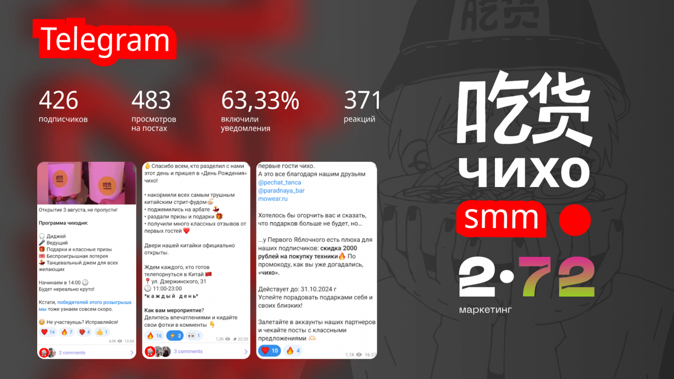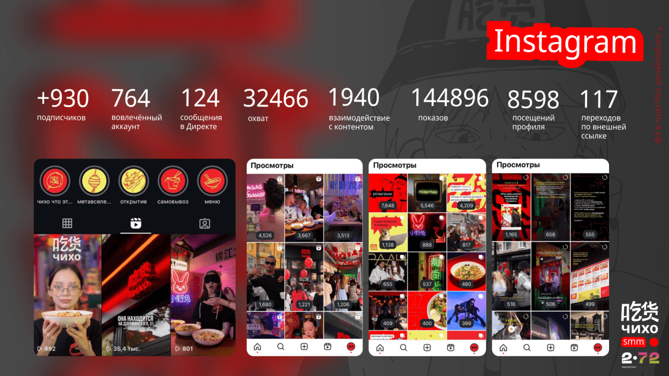 • провели 11 креативных, ярких фотосессий, в которых показали отражение ЦА. Приглашали спортсмена из центра дзюдо, модель и танцоров, которые в полной мере закрепили за чихо ассоциацию с местом, где вкусно, свободно и интересно. Образы, реквизит, дизайн студий и другие локации для съемок — всё пахло Азией и креативом. А однажды мы даже не понарошку убегали от прохожего и успели заснять. Это были одни из самых необычных и нестандартных фотосессий за всю историю работы нашего агентства. Результатом можете насладиться в аккаунте @chiho_tyumen .