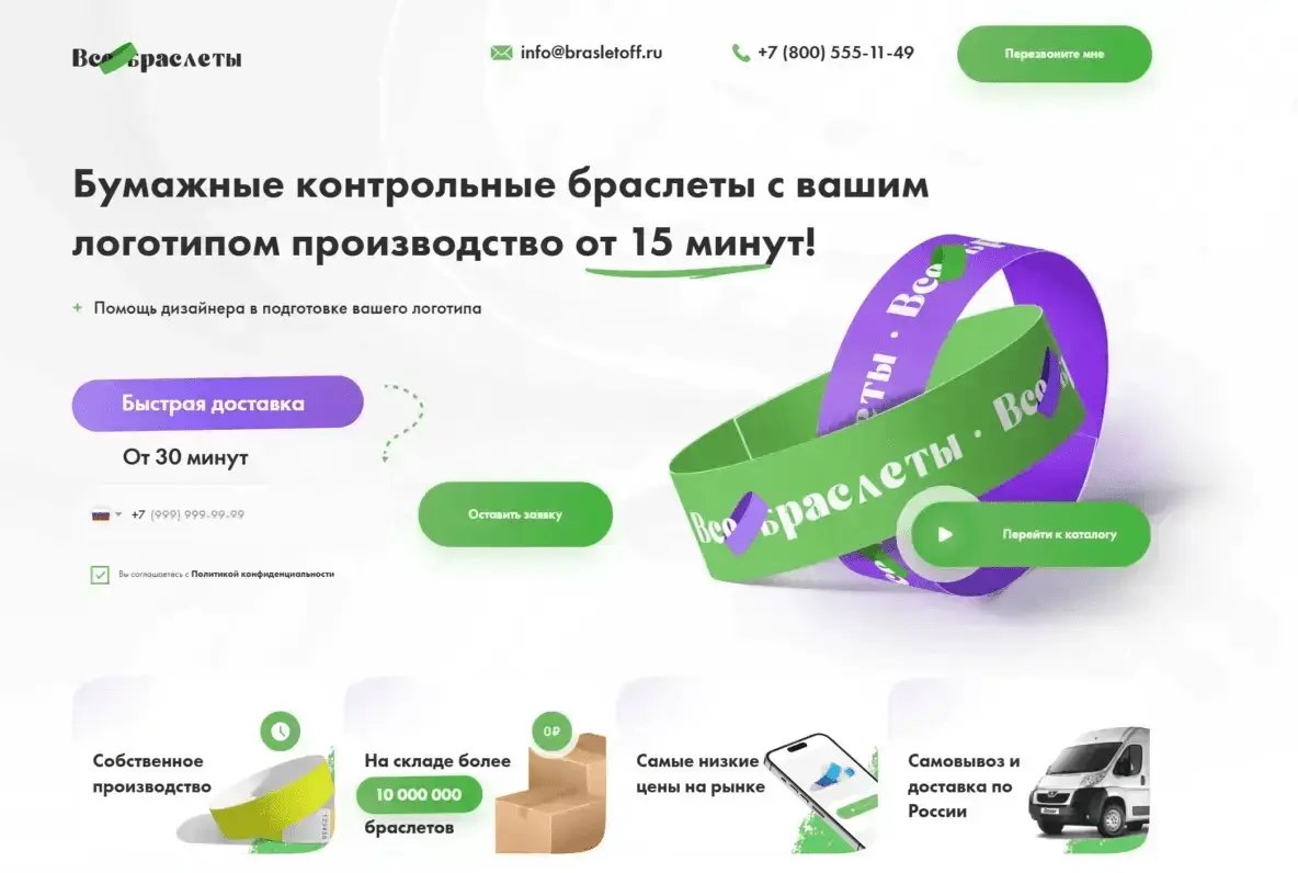 Оффер на первом экране: "Браслеты с вашим логотипом. Производство от 15 минут!"