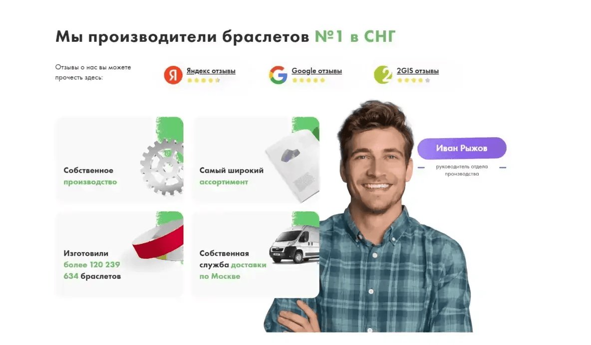Оффер на первом экране: "Браслеты с вашим логотипом. Производство от 15 минут!"