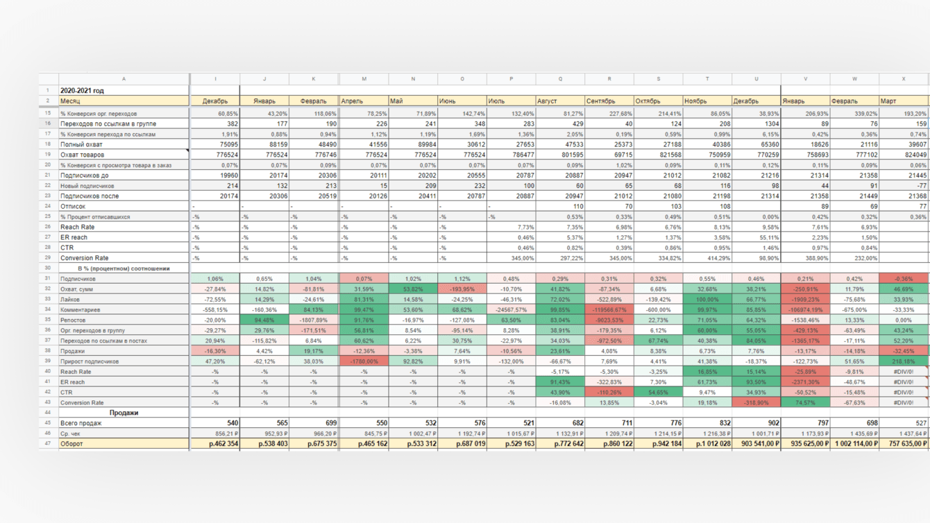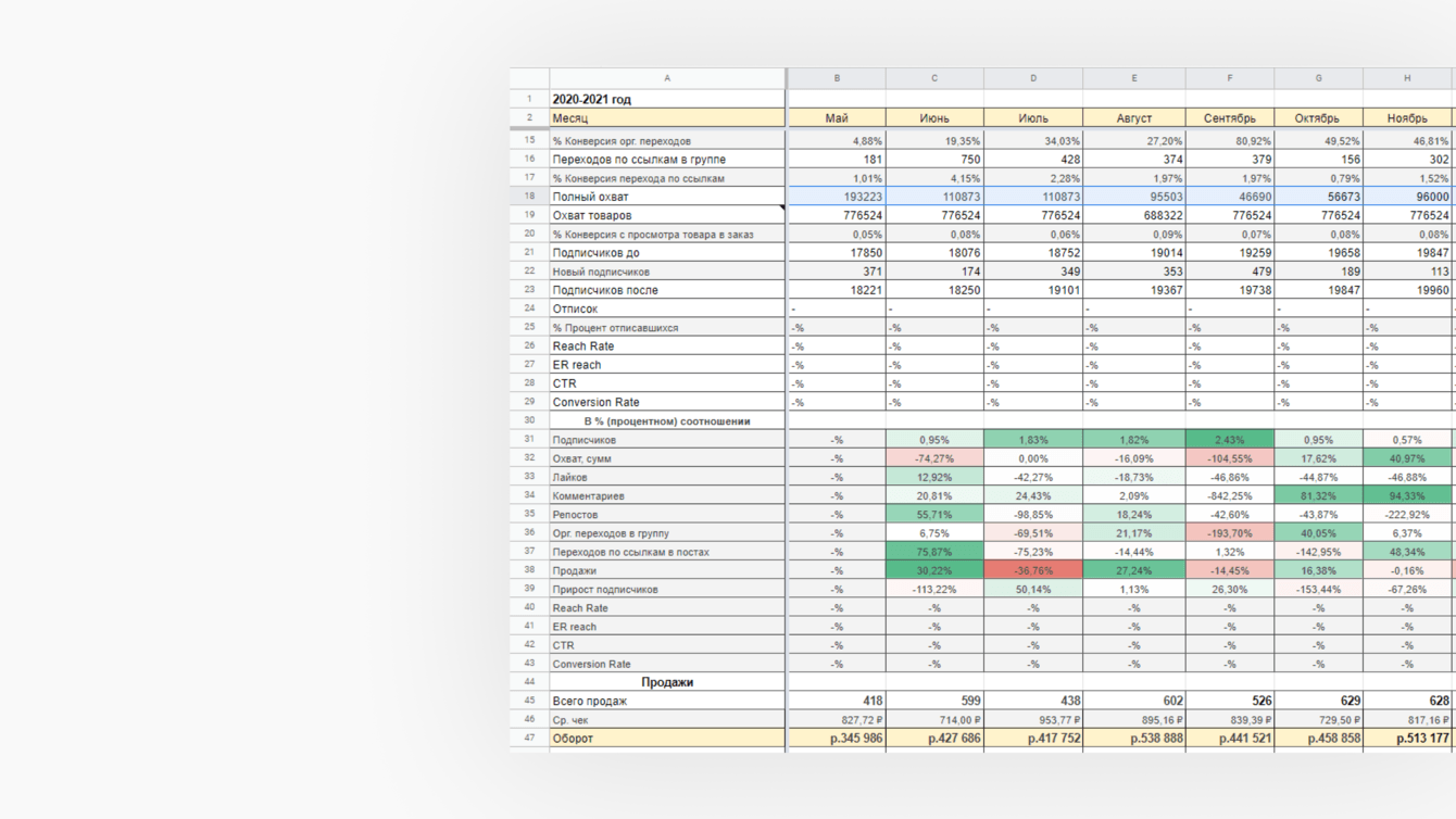 Для этого в компании мы используем таблицу по контент-анализу. С помощью такой таблицы мы отслеживаем эффективность публикаций (контента).