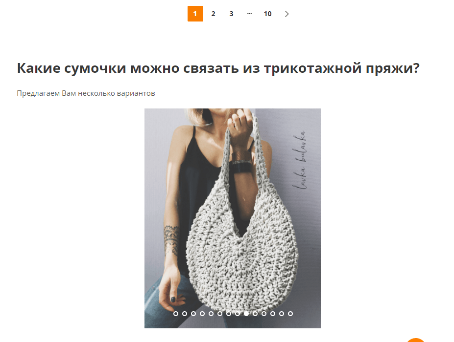 Создание дополнительных страниц по целевым запросам типа «пряжа для вязания сумок». На такие страницы мы разместили не только товары и текст, но и примеры работ, которые можно создать из предложенных товаров:
