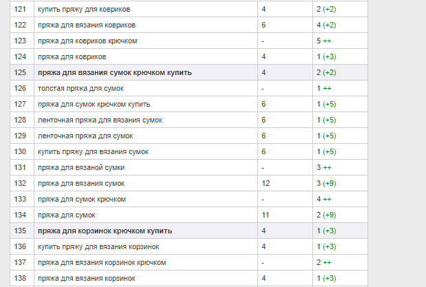 Тщательно проработана семантика. Помимо очевидных коммерческих запросов «купить трикотажную пряжу», «продажа шнура для вязания», проработаны также дополнительные группы запросов товаров по целевому назначению: пряжа для вязания сумок, шнур для вязания коврика и пр. Также подобраны синонимы «пряжа лента», «ленточная пряжа» и пр. Всего подобрано более 3.000 целевых запросов, включая низкочастотные.