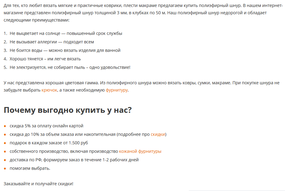 Создание дополнительных страниц по целевым запросам типа «пряжа для вязания сумок». На такие страницы мы разместили не только товары и текст, но и примеры работ, которые можно создать из предложенных товаров: