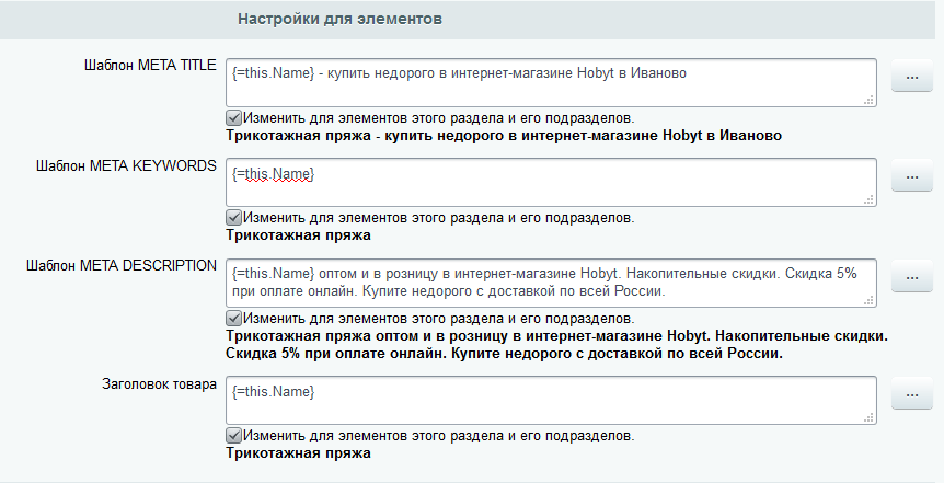 Первоначально товары попадали в 1С и затем на сайт не всегда с адекватными названиями, например: ТП 058 Небесный. Многие товары попадают в поисковые системы, индексируются и показываются в результатах поиска по точным запросам. Для хорошего ранжирования требовалось больше информации в названии, на базе которого формируются мета-теги. Клиенту была предложена оптимальная структура названия с отражением основной информации: родовое название, артикул, размер и пр. Это также удобно для клиентов, который часто пробегаются по названиям, не открывая карточку, если не заинтересуются товаром.