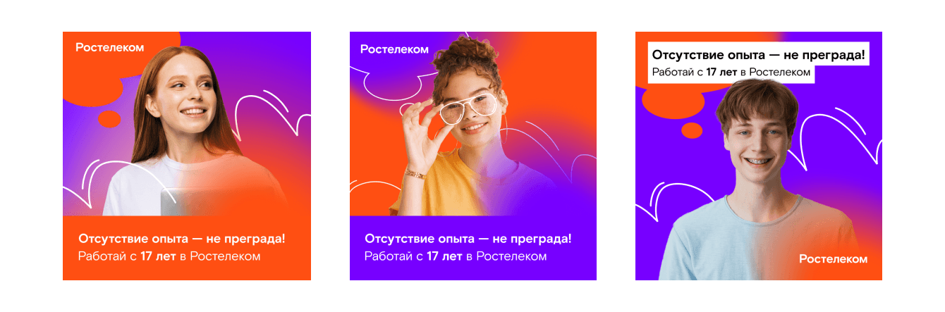 После анализа первого периода решили вместе с клиентом ориентироваться на ЦА от 17 до 23 лет. Клиент отдал разработку креативов нашему отделу дизайна. Мы сохранили в креативах фирменный стиль «Ростелекома», но сделали упор на молодую аудиторию.