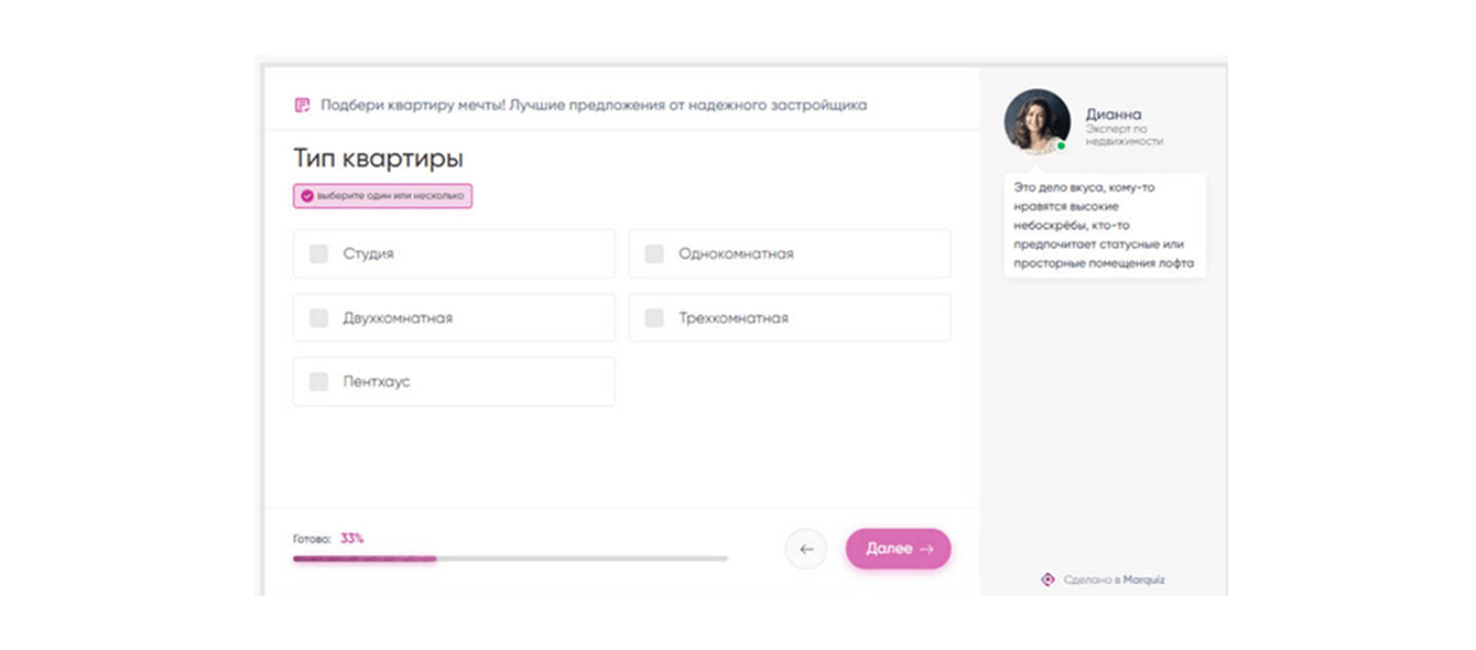 Сайт клиента не был оптимизирован под заявки, поэтому мы разработали квиз из 5 простых вопросов: количество комнат, метраж, ценовой диапазон и др.