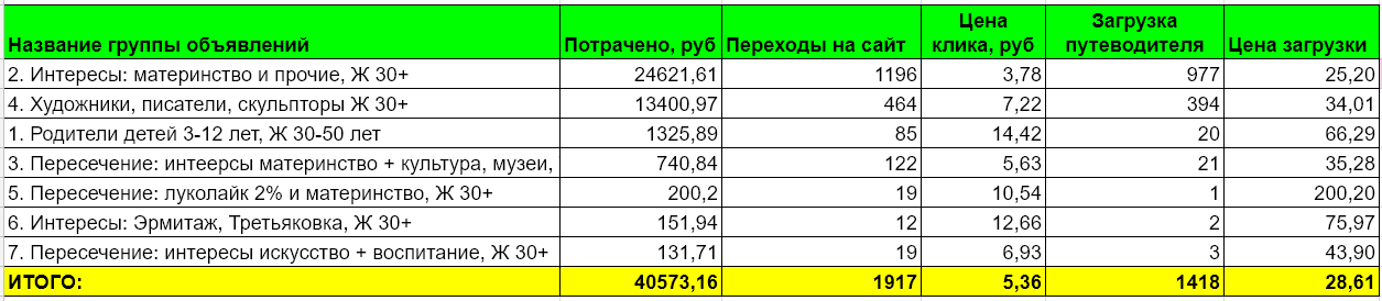 Общий результат — 2591 загрузок путеводителя по средней цене 27 рублей. С 2017 года мы перестали с ним работать.