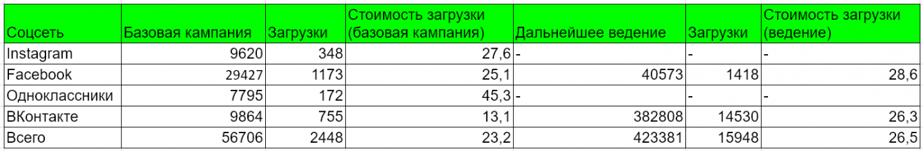 При базовой рекламной кампании в Facebook* мы сразу уложились в поставленные KPI. Стоимость загрузки составила 25 рублей. Приятный результат был получен после тестирования около 7-10 аудиторий.