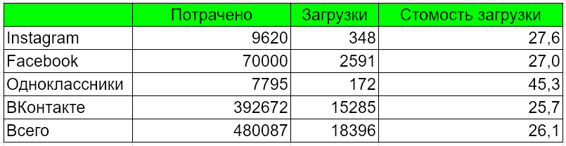 За время работы было потрачено 480 087 рублей. Мы получили 18 396 загрузок стоимостью 26 рублей.