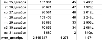 В декабре мы открутили 2 515 000р и получили 1276 чистых заявки по стоимости 1971р