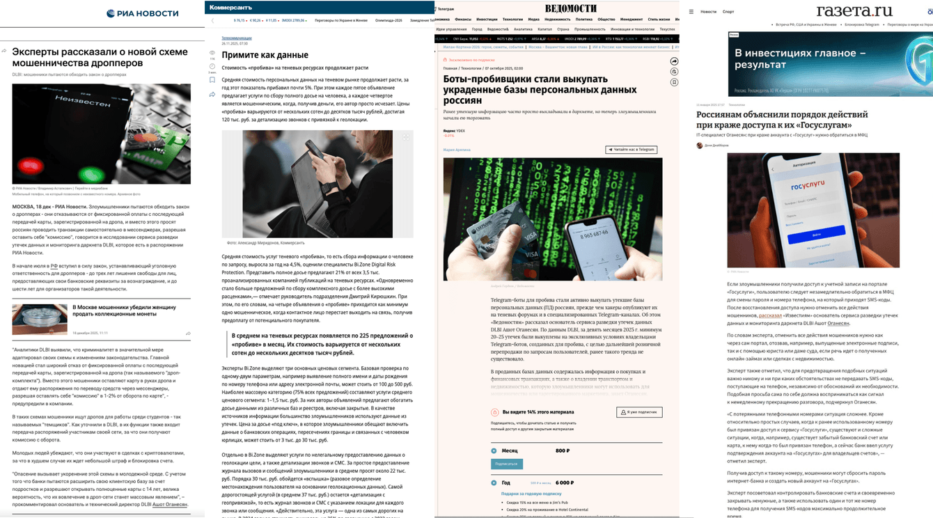 Всего за год вышло около 2 тыс. публикаций с упоминанием DLBI. Совокупный медиаиндекс, по данным системы «Медиалогия», составил более 15 000 пунктов. По итогам года агентству удалось не только сохранить, но и усилить экспертный статус спикеров DLBI, а также закрепить за сервисом репутацию одного из ключевых источников аналитики по информационной безопасности, действиям мошенников и утечкам данных.