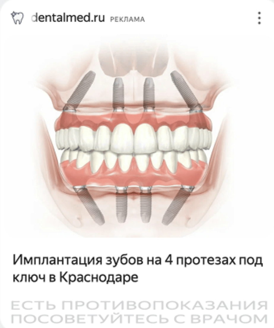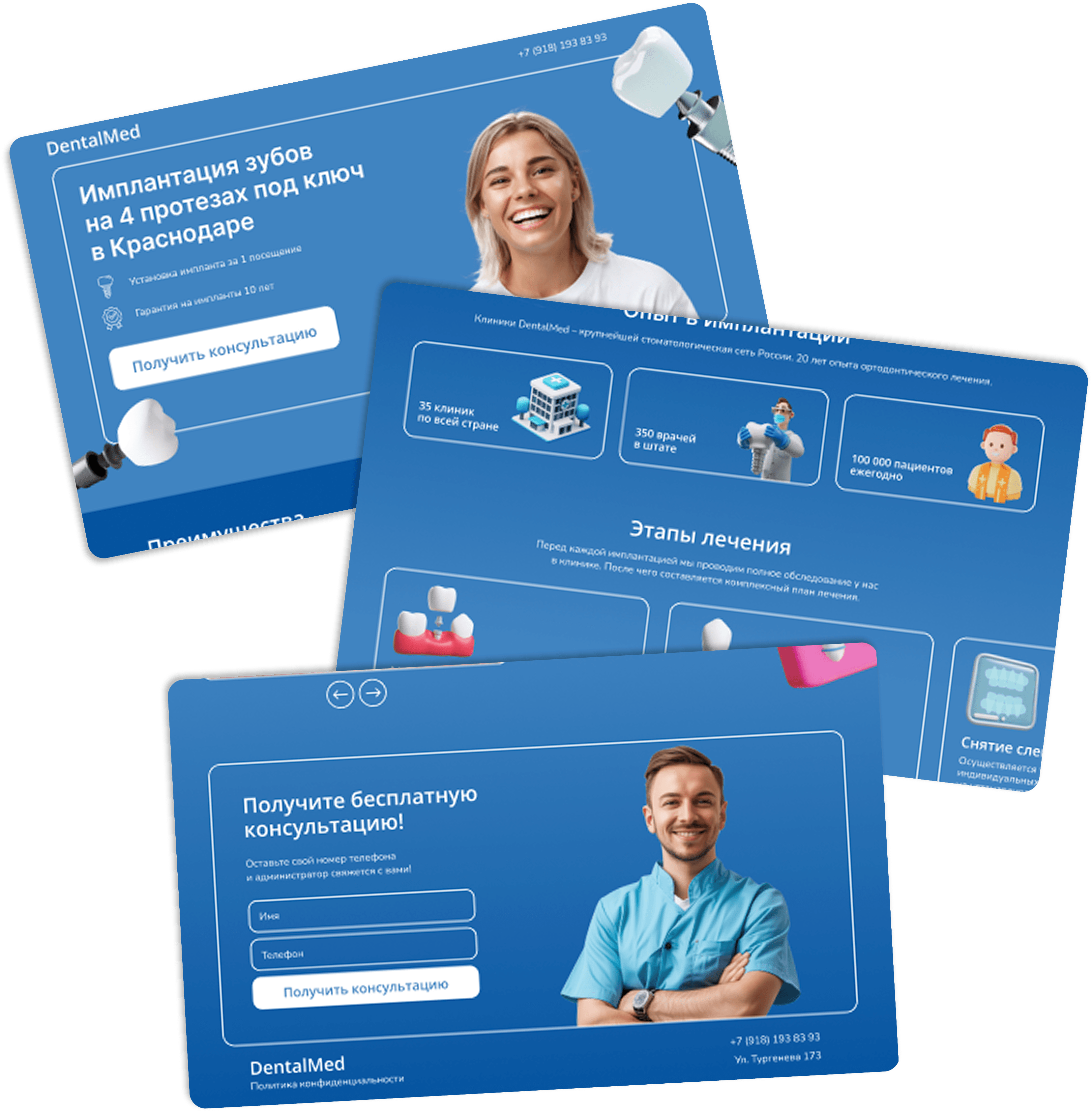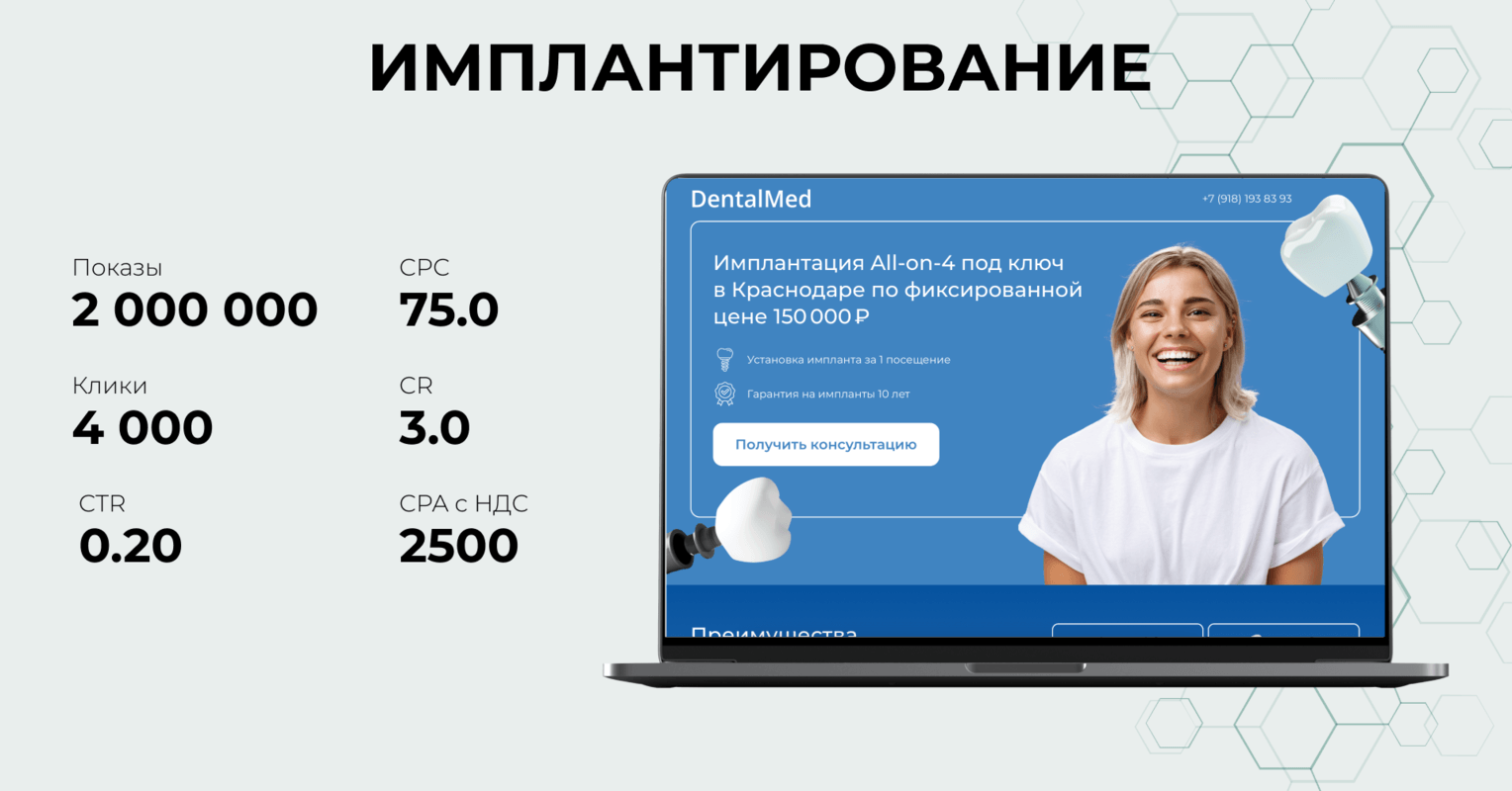 DentalMed — стоматологическая клиника в Краснодаре, которая впервые решила запустить рекламу для привлечения пациентов на услугу «Имплантация All-on-4». До этого они не использовали платное продвижение, поэтому нам предстояло разработать стратегию с нуля, создать рекламные кампании и спроектировать эффективную посадочную страницу. Наша цель — сделать так, чтобы потенциальные пациенты видели рекламу, переходили на сайт и оставляли заявки на консультацию.
