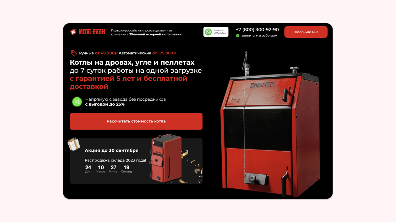 Настроили рекламные объявления на 55 вариантов лендингов: на первом экране сайта УТП меняется в соответствии с рекламным объявлением. Такой подход позволяет повышать конверсию за счет релевантности предложений и точного попадания в интересы целевой аудитории.