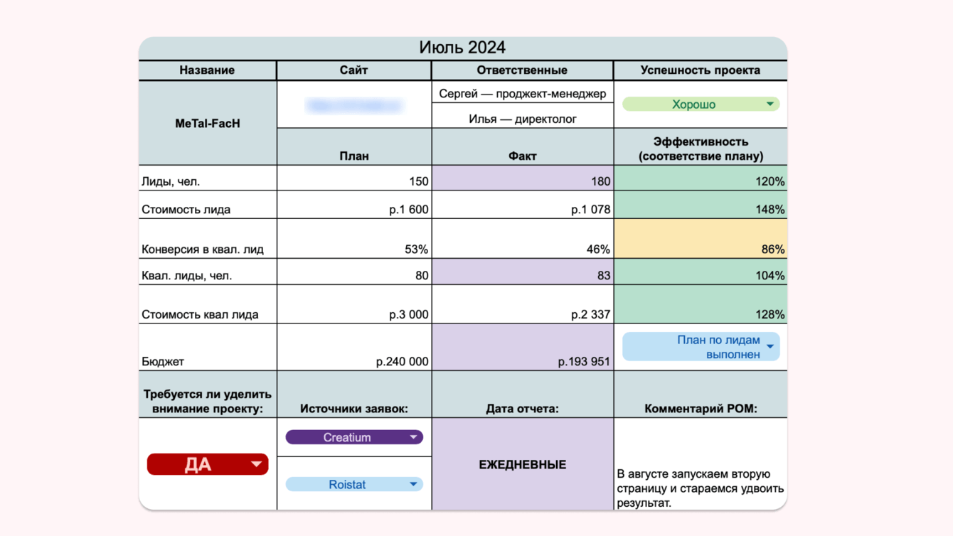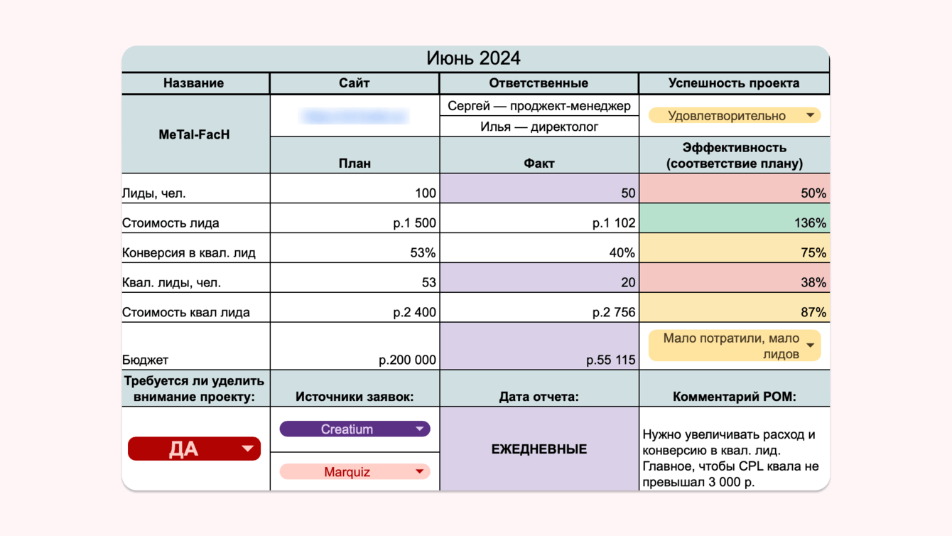 Также с данным клиентом мы внедрили ежедневные РНП. На них наш проджект-менеджер и маркетолог клиента совместно анализируют количество и качество заявок.
