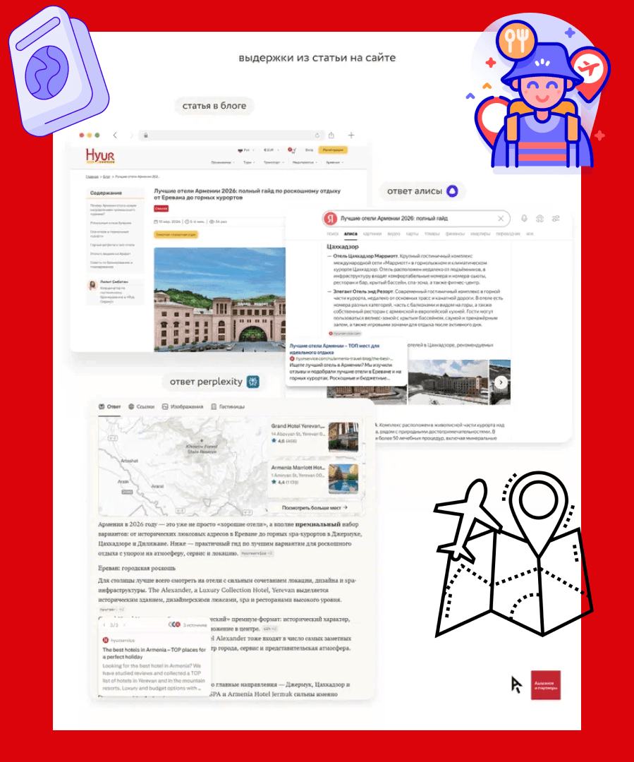 Крупные сайты и агрегаторы по-прежнему доминируют в классической поисковой выдаче, поэтому нишевым операторам сложно конкурировать с ними по высокочастотным кластерам запросов. В генеративных ответах и ИИ-ассистентах большую роль играют экспертность, точность и практическая ценность контента, а не только масштаб сайта. Для нишевых проектов это создает дополнительные возможности для продвижения в новой поисковой среде. Сегодня покажем кейс туристической компании, которая работает на одном направлении путешествий, но привлекает клиентов со всего мира через ИИ.