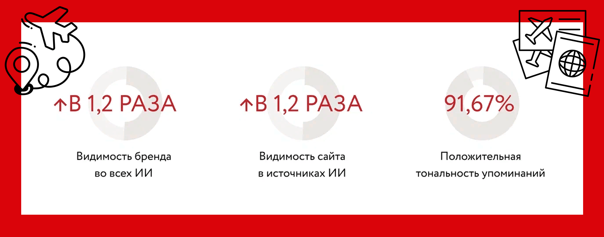 Таким образом, бренд на основных площадках демонстрирует устойчивый рост видимости и репутации. Это повышает его узнаваемость и доверие со стороны туристической аудитории, которая предпочитает выбирать тур с помощью AI-ассистентов.