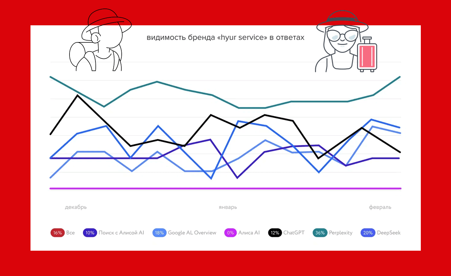 При этом в некоторых нейросетях видимость стала намного больше: например, в Perplexity она составляет 36%, в DeepSeek — 20%, в Google Al Overview — 18%.