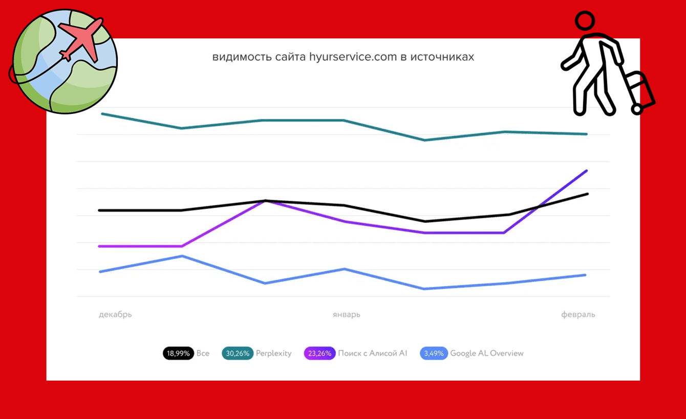 Сайт стал заметно чаще появляться в генеративных ответах поисковых систем и популярных нейросетей, включая Perplexity, Google AI Overview, Поиск с Алисой, ChatGPT, Алису AI, DeepSeek, GigaChat и Gemini. Мы находимся на стартовом этапе проекта, но уже в первые три месяца работы удалось получить заметный результат по AI-видимости.