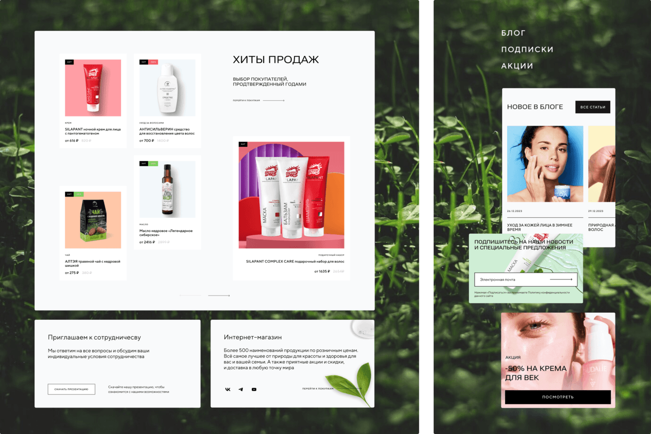 На первом этапе был проведён анализ взаимодействия брендов с оптовыми клиентами и партнёрами, что помогло сформировать структуру главной страницы, ориентированной на формат корпоративного сайта. Это позволило подчеркнуть ключевые моменты в работе с партнёрами и улучшить навигацию. Дополнительно мы изучили тренды на рынке онлайн-продаж косметики, интересы покупателей экологичных продуктов и практики конкурентов. Этот анализ помог создать сайт, который учитывает особенности целевой аудитории и эффективно презентует ценности бренда.