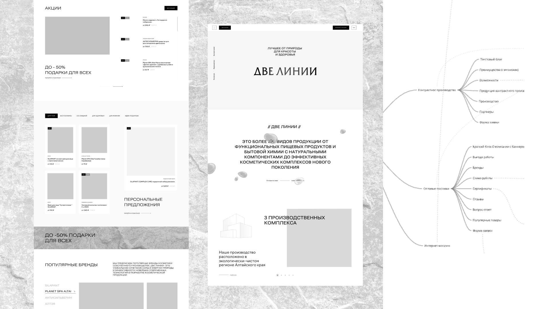 На основе собранных данных мы разработали подробную карту сайта, в которой учли ключевые направления и функциональные возможности, важные для взаимодействия с разными категориями пользователей. Затем были отрисованы прототипы основных страниц: главная, каталог, а также раздел посвященный производству.