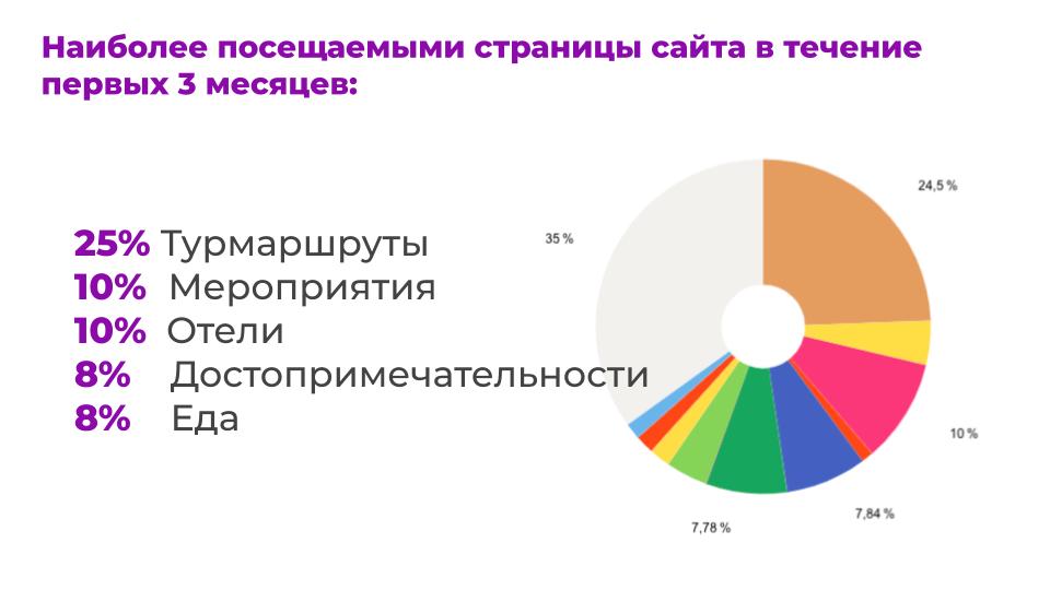 Общая статистика хорошо показывает, что туристический портал оказался нужным продуктом в регионе. Кроме социальной значимости, сайт способствует продвижению малого туристического сегмента, реализации туристического потенциала республики, о чем говорит крупный корпоративный заказ на туристический отдых.