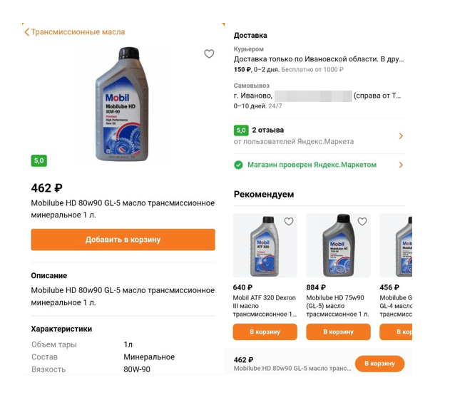 Создали турбо-страницы для всех товаров с картинками и доступных к заказу. Турбо-страницы – облегчённый вариант страниц, которые поисковые системы ранжируют выше, особенно на мобильных устройствах. Трубо-страницы мы генерировали с помощью специального модуля для создания yml-файла (также подходит и для загрузки в яндекс.маркет). При этом для каждой категории товаров создали свой набор свойств. Например, для трансмиссионного масла такой набор свойств: