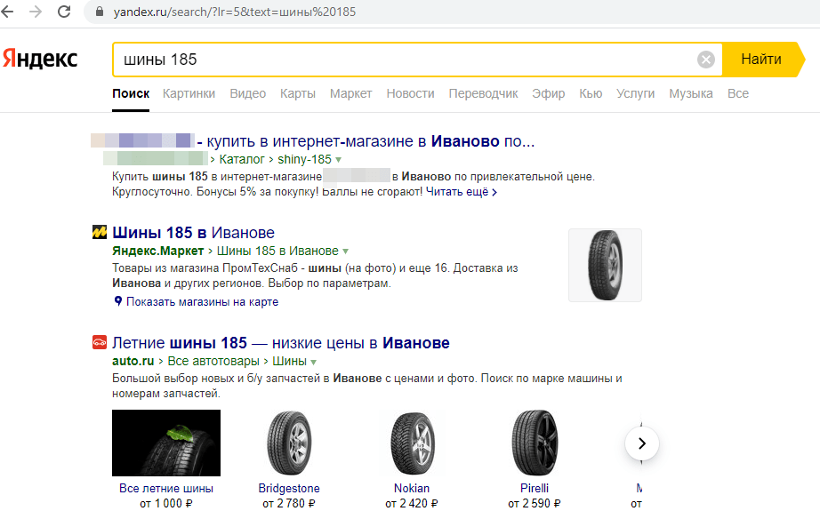 При этом такие страницы содержат уникальные мета-теги, заголовки, тексты, ЧПУ-адреса с вождением запроса, что позволяет им быть авторитетными и занимать топовые места в результатах поиска. Например, страница по шинами 185 мм в поиске яндекса на 1 месте: