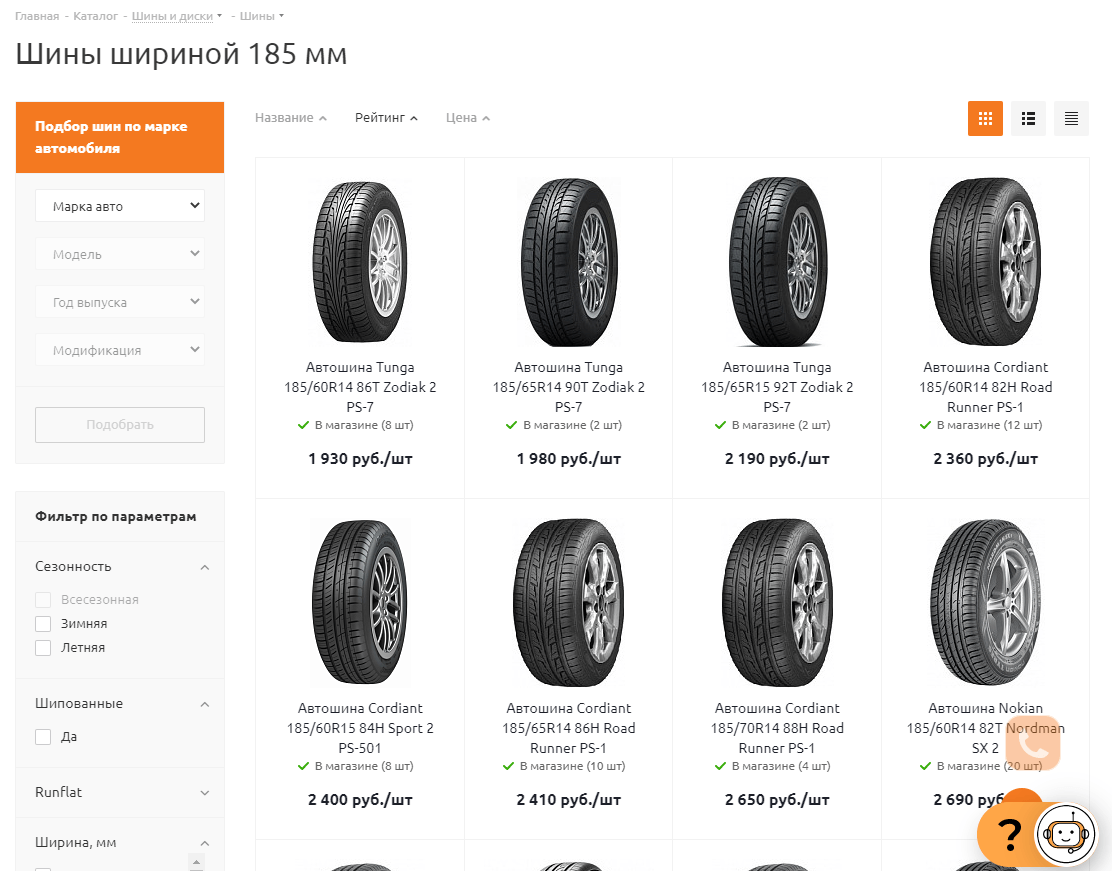 Для удобного подбора шин и дисков реализован фильтр по марке и модели автомобиля. Также есть фильтр по другим параметрам (диаметр, ширина, сезон и пр).