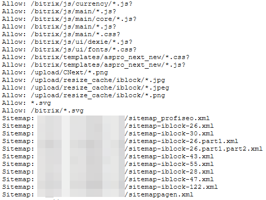Сайт большой (более 100.000 страниц), поэтому важно обеспечить быструю индексацию (обход) поисковыми роботами. Для этого для каждого инфоблока мы сгенерировали отдельный sitemap.xml и добавили ссылки на каждый из них в файл robots.txt. Предусмотрели sitemap для псевдостраниц (ссылки генерируются автоматически при создании страницы). Также настроили автоматическую проверку наличия большого числа не включенных в карту сайта страниц товаров (если таковое обнаруживается, мы разбираемся в причинах, а они всегда удивительно разнообразные и любопытные).