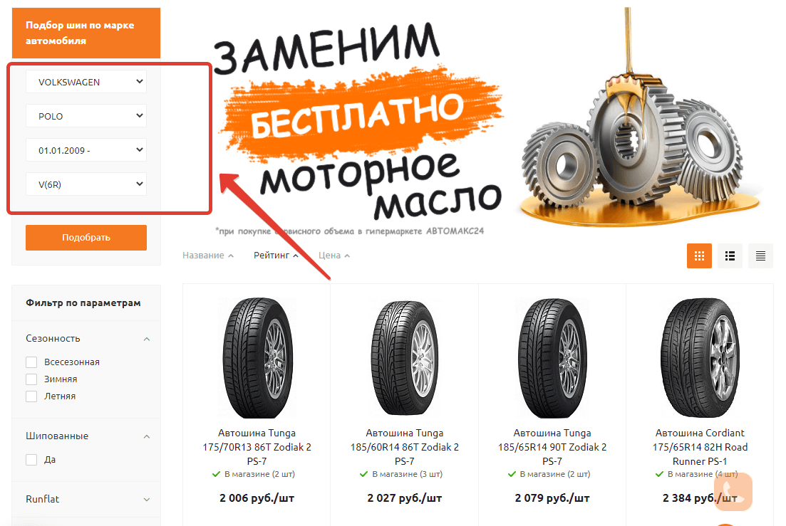 Для удобного подбора шин и дисков реализован фильтр по марке и модели автомобиля. Также есть фильтр по другим параметрам (диаметр, ширина, сезон и пр).