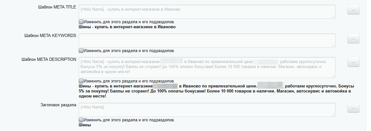 Прописаны шаблоны мета-тегов, включающие коммерческие слова «купить», «цена», «интернет-магазин» и пр. Шаблоны позволяют автоматически добавлять необходимые мета-теги при создании страницы. Не нужно отслеживать новые страницы и прописывать мета-теги для каждой отдельно. И при этом у всех станиц – уникальные мета-теги title и description, что важно для поисковых систем.