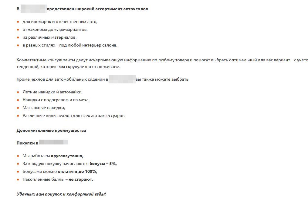 Для ряда страниц мы написали тексты, при этом это не переспамленные ключевыми словами так называемые «сеошные простыни», а небольшие полезные тексты, основная цель которых – рассказать о товарах, услугах и преимуществах самой компании. При этом мы оформляем тексты так, чтобы их было легко и приятно читать: