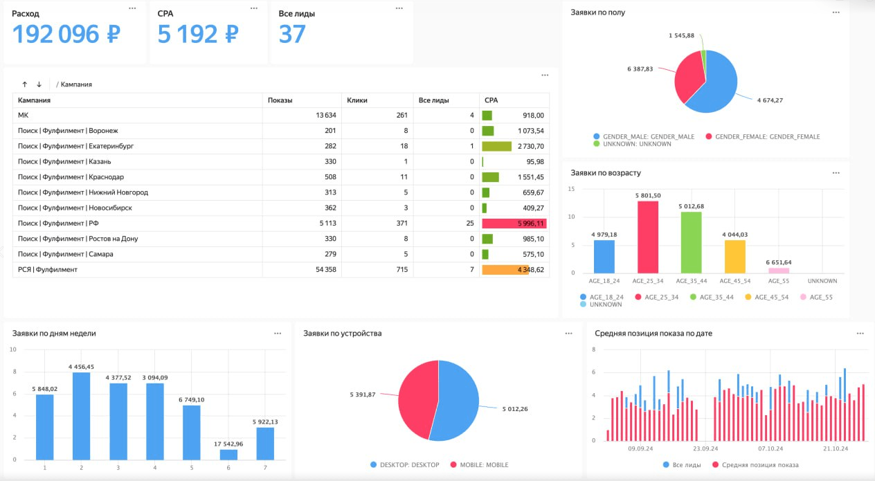 Чтобы вести отчетность по проекту, мы собрали дашборд в в Data Lens, обновляемый автоматически в реальном времени, где видно, в какую сторону нужны корректировки. Мы считаем, что важно держать руку на пульсе, но заходить для этого каждый день в 10 срезов, чтобы мониторить обстановку, достаточно неудобно. Динамический отчет помогает держать ситуацию под контролем - оперативно отсекать группы, гео, ключи, РК, делать корректировки по полу, доходу, возрасту, устройствам, возрасту и т.д.