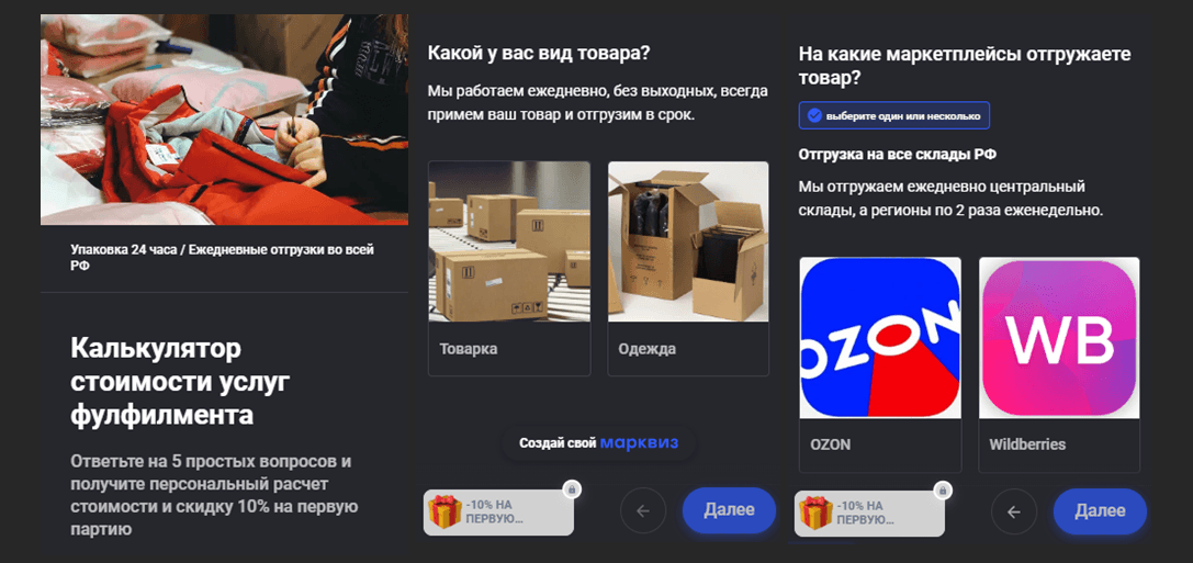 У фулфилментов специфичная ниша – в ней посетителям сайта особенно важно знать стоимость, так как b2b-клиенты хотят получить качественную услугу, сэкономив на издержках. Мы решили не делать квиз, который в конце просит ввести номер телефона, поэтому сделали такой, который дает предварительный расчет стоимости. При этом у посетителей осталась возможность подать заявку, если нужен очень детальный расчет. Также мы добавили напоминание после отправки формы , чтобы клиенты не забывали отвечать на звонки с неизвестного номера, так как в эпоху спама многие предпочитают общение в мессенджерах. Квиз начал работать хорошо: появилась прозрачность, люди видели выгодные цены в конце квиза и оставляли заявку на сотрудничество.