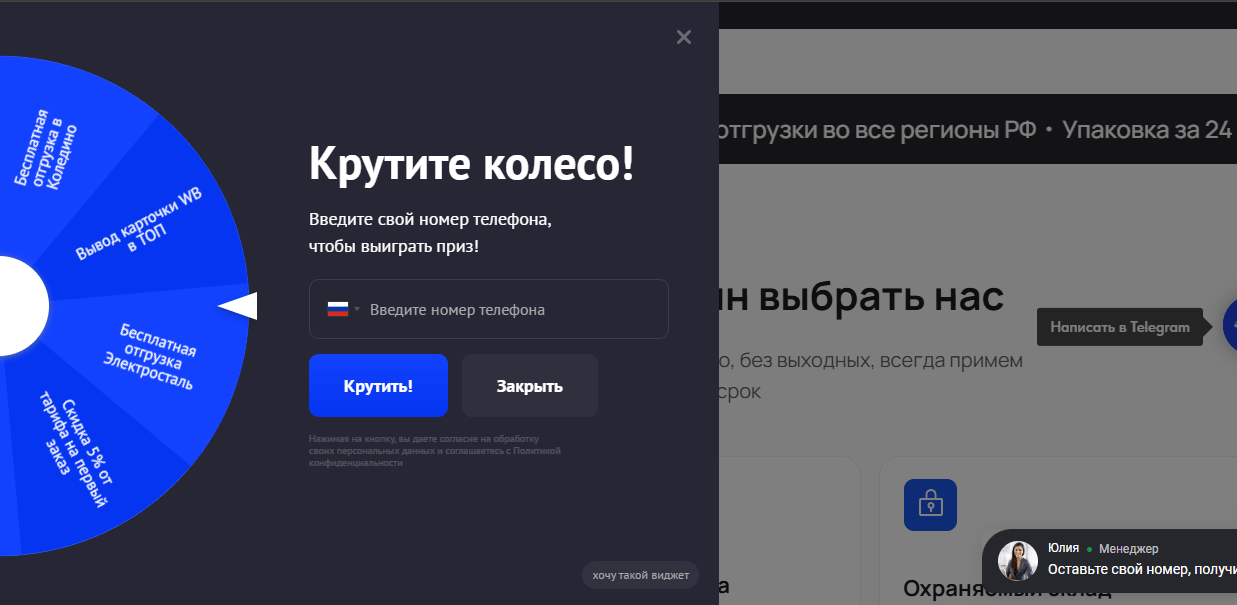 Перед новогодними праздниками мы решили добавить немного геймификации и порадовать подарками потенциальных клиентов. Да, возможно, в b2b необходимости в этом нет, но в моменте это было к месту и мы действительно стали получать дополнительные заявки с колеса фортуны.