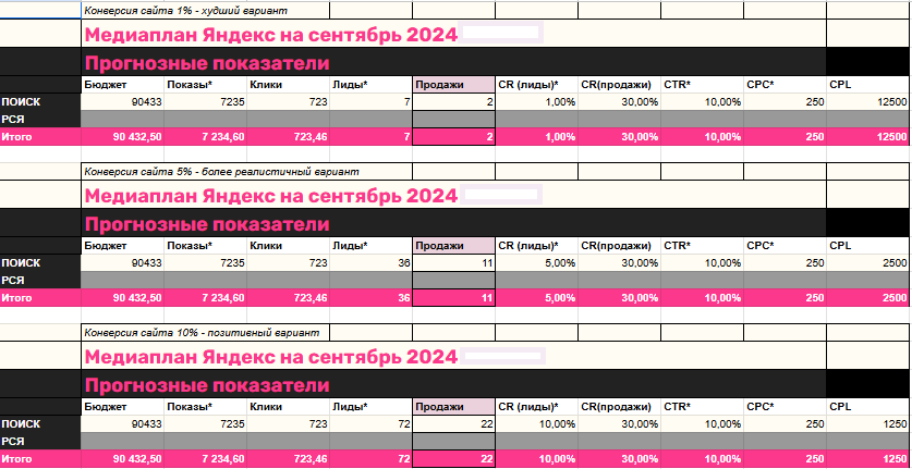 На следующем этапе мы приступили к настройке рекламы. Чтобы определиться с бюджетом, построили вилку с плохим, хорошим и реалистичным прогнозом. Мы уверены, что очень важно обговорить с клиентом прогнозы в самом начале работы, чтобы сопоставить их с его ожиданиями. Это помогает выстроить долгосрочные отношения, ведь результат работы рекламы чаще всего улучшается со временем - маркетолог успевает погрузиться в проект, понять его и ЦА и протестировать множество гипотез, отсекая нецелевое и инвестируя в работающее.