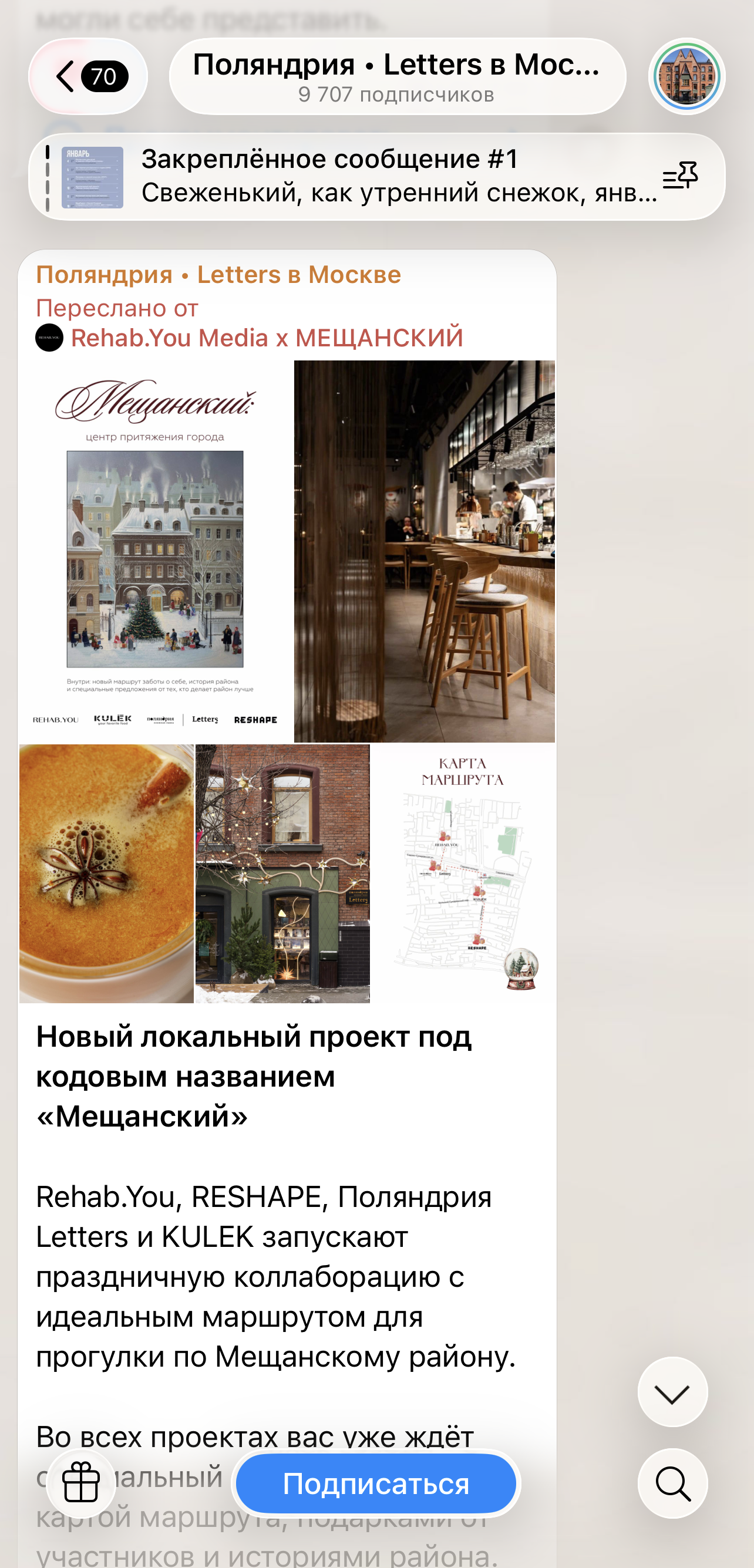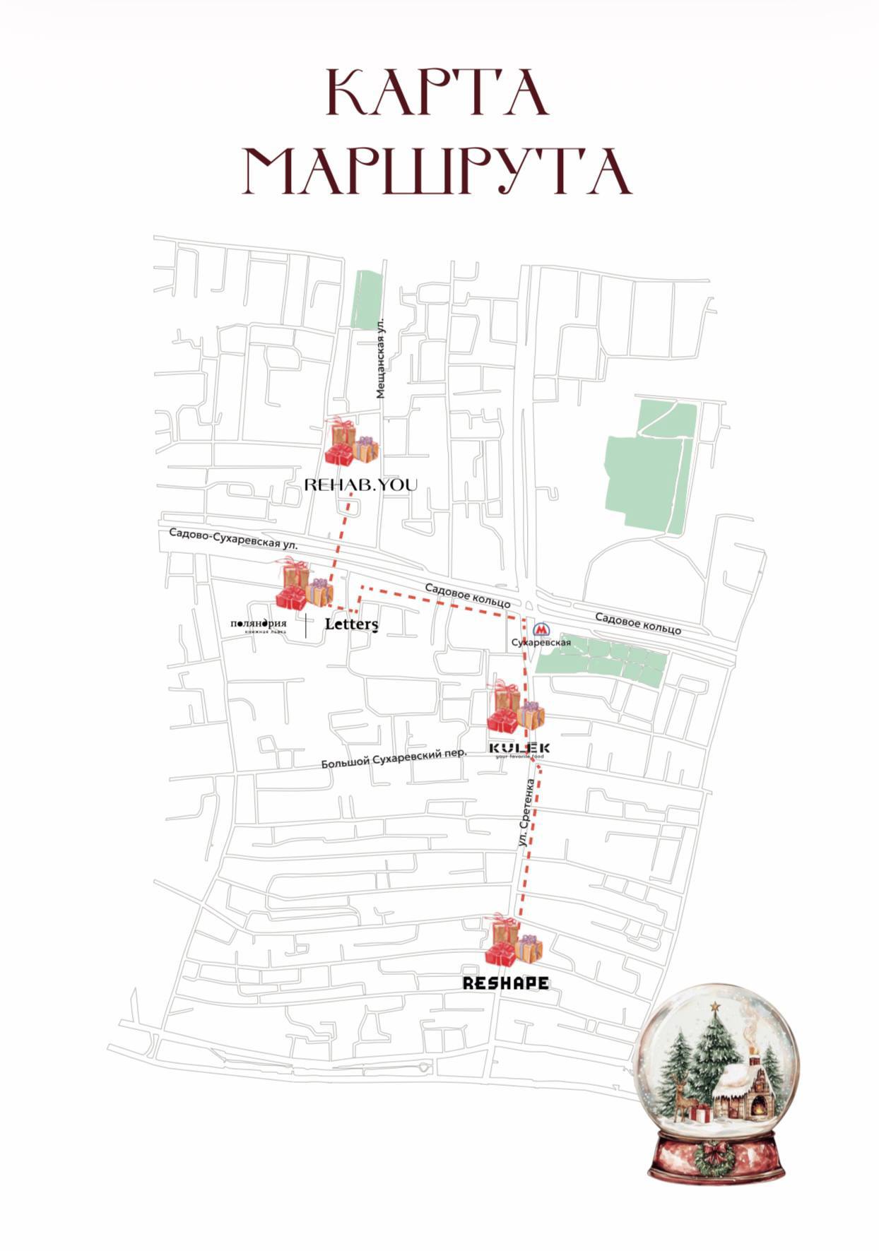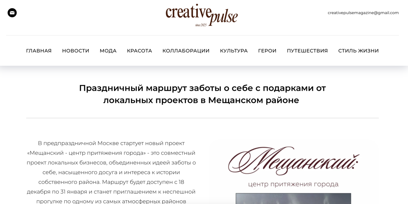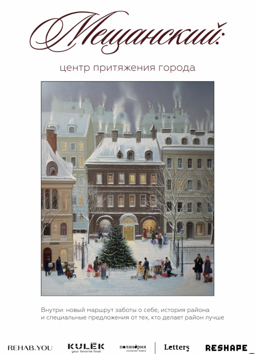 Мы создали праздничный маршрут по району с подарками от локальных проектов. Выпустили газету с историей района и маршрутом, который включал спецпредложения от четырех проектов — сеть массажных клубов Rehab.You, фитнес-студии Reshape, римские бистро KULEK и книжное издательство с кофейней «Поляндрия Letters».