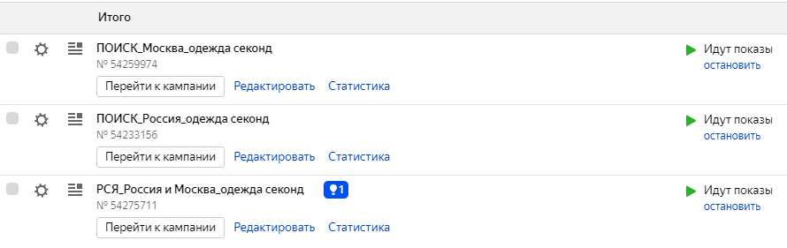 В соответствии с каждой задачей кампании скорректировали группы ключевых слов и добавили группы объявлений в кампании. Итого получилось: