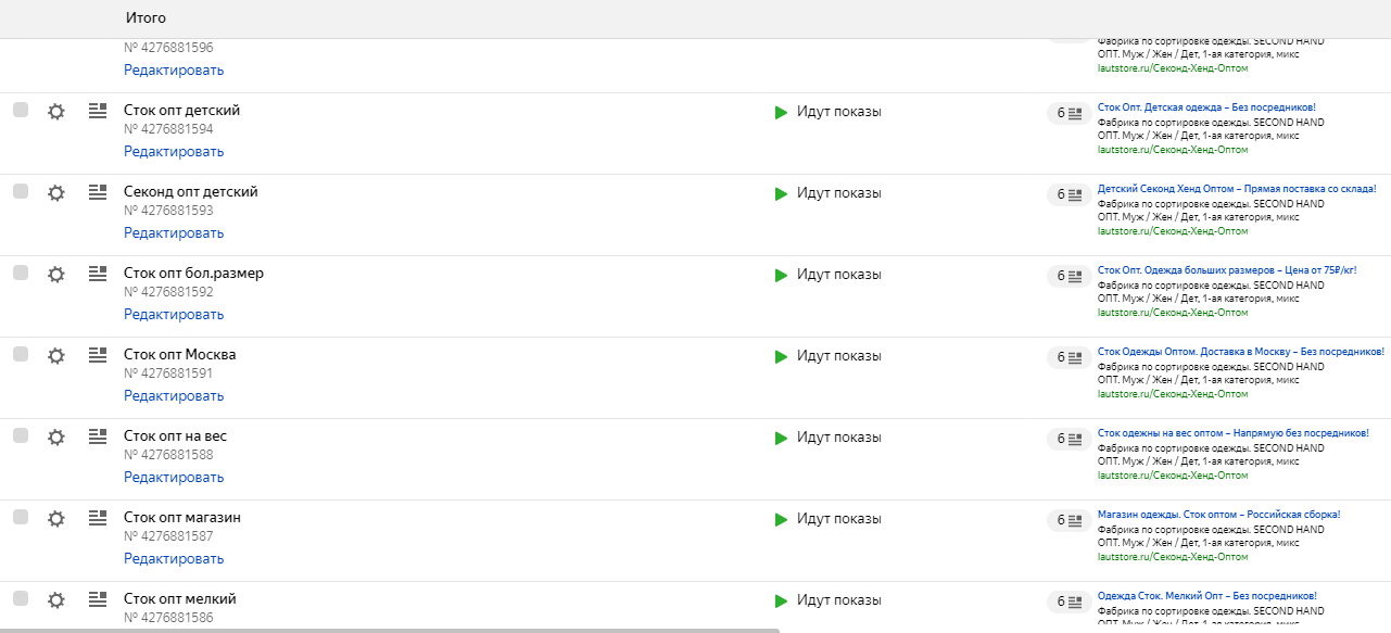 В соответствии с каждой задачей кампании скорректировали группы ключевых слов и добавили группы объявлений в кампании. Итого получилось: