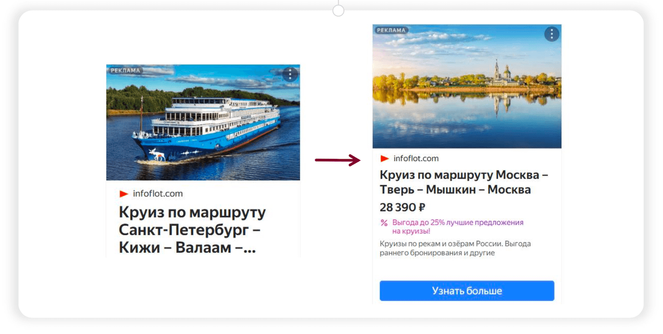 В рамках запуска кампаний со смарт-баннерами под каждый теплоход настроили две группы объявлений: офферный ретаргетинг и look-a-like (такая структура позволяет более глубинно отслеживать эффективность по каждому кораблю, охватывая как аудиторию, интересующуюся конкретным круизом, так и похожих пользователей).