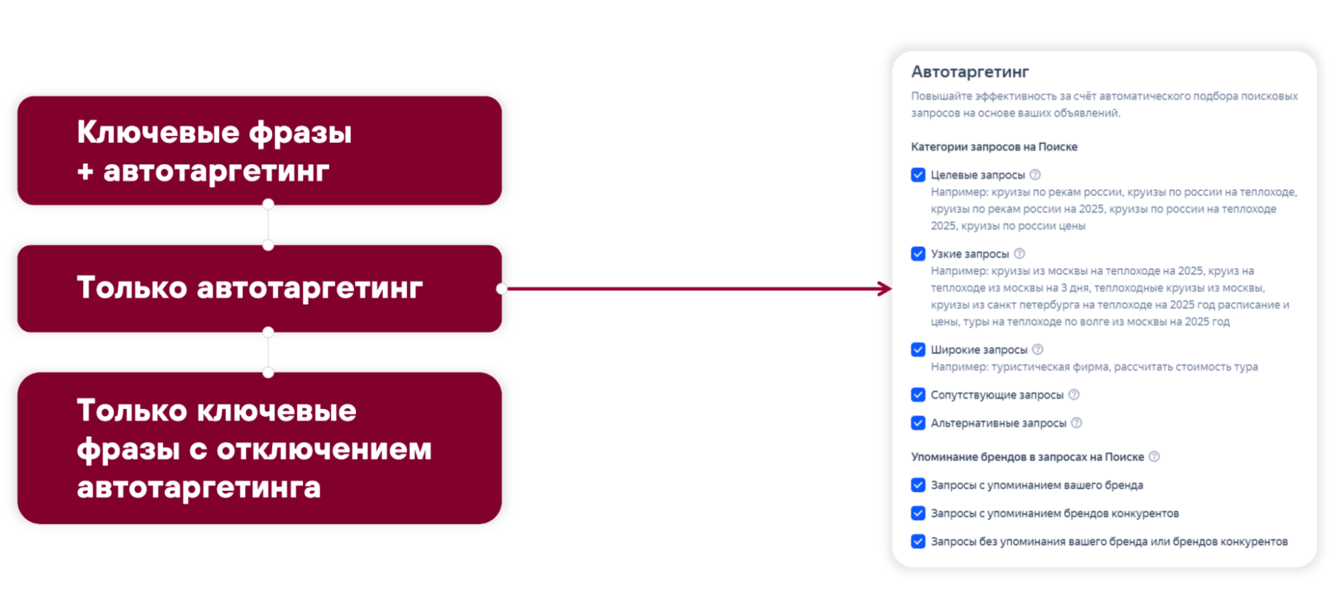 Для проверки эффективности определенного набора ключевых фраз отключили поисковой автотаргетинг.